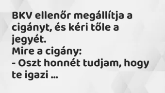 BKV ellenőr megállítja a cigányt, és kéri tőle a jegyét.Mire a cigány:- Oszt honnét tudjam, hogy te igazi ellenőr vagy?Ellenőr:- Itt az igazolványom, nézd meg!Cigány nézegeti, majd megszólal:-…