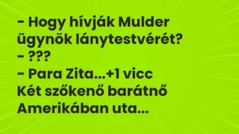 - Hogy hívják Mulder ügynök lánytestvérét?- ???- Para Zita...+1 vicc Két szőkenő barátnő Amerikában utazgat. Egyszer eltévednek, nagy nehezen bekeverednek egy városkába. Bemennek az első étterembe,…