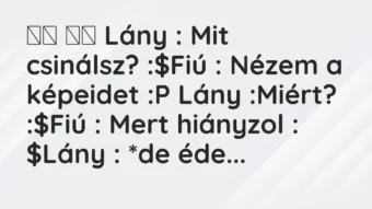 Lány : Mit csinálsz? :$Fiú : Nézem a képeidet :P Lány :Miért? :$Fiú : Mert hiányzol : $Lány : *de édes* :$ Milyen bokszer van rajtad? ^^Fiú : Semmilyen :DLány : Mert? :OFiú : Mondom,h a képeidet nézem…