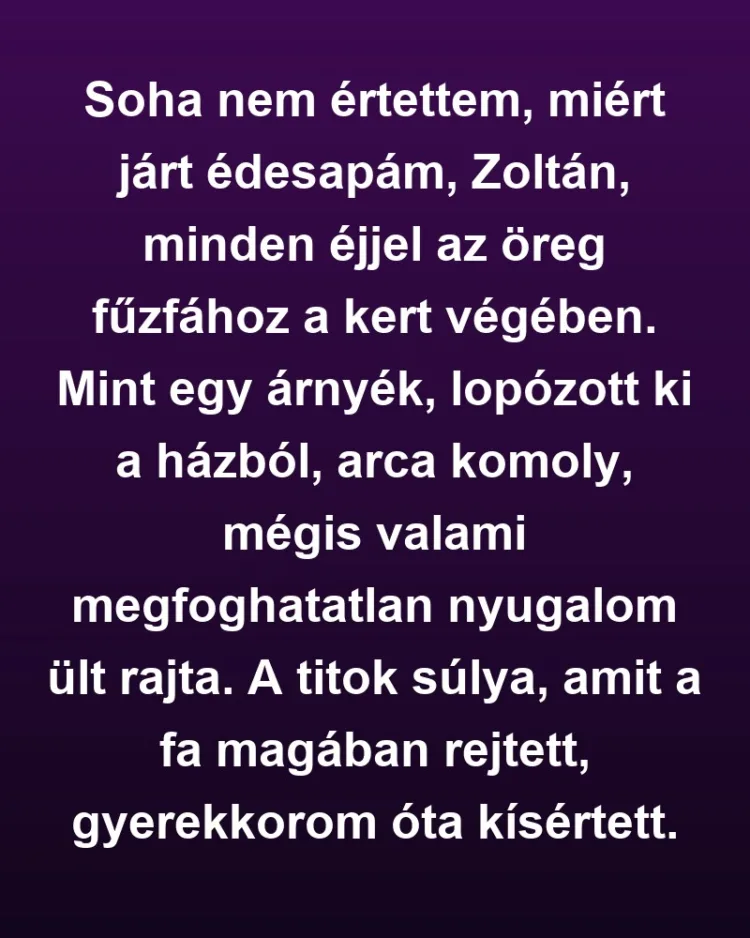 Évek teltek el, édesanyám, Eszter, mindig mosolyogva figyelte apámat, mintha ő is ismerné a titkot, ami megnyugtatta volna. Mikor már nagylány lettem, egy este összeszedtem a bátorságom és rákérdeztem. „Apa, miért jársz mindig a fűzfához?” – kérdeztem halkan. Mosolyodott, de a szemében villant a régi bánat. „Egy nap majd megtudod, kislányom. Ez egy gyönyörű és szomorú történet.”