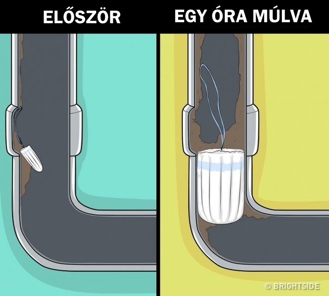 A menstruációs termékek tervezésekor a nedvszívó képesség volt a fő szempont, így nem meglepő, hogy a nedvesség hatására nagyméretűre duzzadnak, ami súlyos dugulást okozhat a lefolyóban. Ezért fontos, hogy mindig dobd a szemetesbe őket!