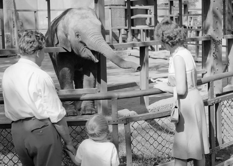 1963. Látogatók csemegével etetik az elefántot a Budapest Főváros Állat- és Növénykertjében.