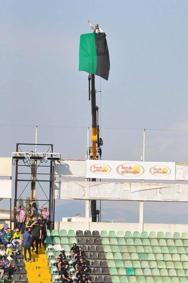 Ezt a tősgyökeres foci drukkert kitiltották a stadionból egy részegen elkövetett verekedés miatt, ezért kibérelt egy darut, hogy így szurkolhasson kedvenc csapatának.