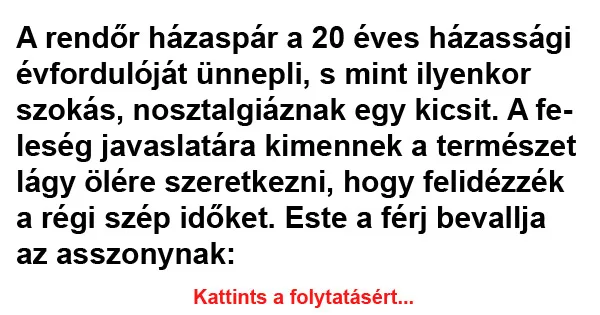 Hogyan ünneplik egy rendőr házaspár a 20 éves házassági évfordulójukat? Néha a legklasszikusabb módszerek működnek a legjobban. Az újra felidézett nosztalgiak, az őszinte beszélgetések és az erdei kalandok mind különleges pillanatokat hoznak létre.