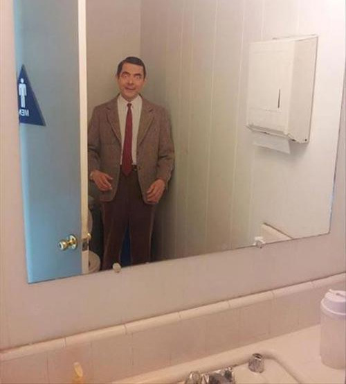 4. Papírból kivágott Mr. Bean figura a irodai mosdóban