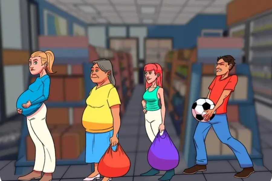 Három nőt és egy férfit látunk a képen. Mind a négyen sorban állnak, valamiféle nagy csomaggal, vagy táskával a kezükben, illetve van köztük egy várandós kismama is. Mind a négyőjüknek lehetőségük lett volna ellopni egy boltból egy dinnyét – de vajon melyikőjük a valódi tettes?