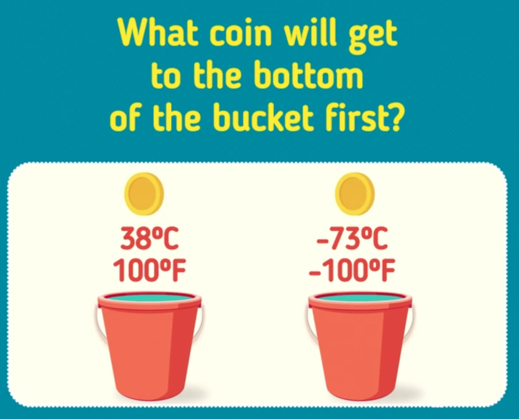 Mielőtt felfednénk a jó választ, adunk egy kis segítséget. A vödrökben láthatóan ugyanannyi mennyiségű víz van, az érmék ugyanolyan távolságra vannak mindkét vödörtől. Az egyetlen plusz információ, amit kapunk, az a vízhőmérséklet – nem véletlen, hogy épp ebből kell kiindulnunk a megfejtéshez. A baloldali vödörben 38 fokos víz van, vagyis meleg víz, ami azonban nem túl forró ahhoz, hogy bármit is csináljon az érménkkel. A jobb oldali vödörben lévő víz azonban -73 fokos: vagyis ebben a vödörben már nem is víz van – hanem jég.