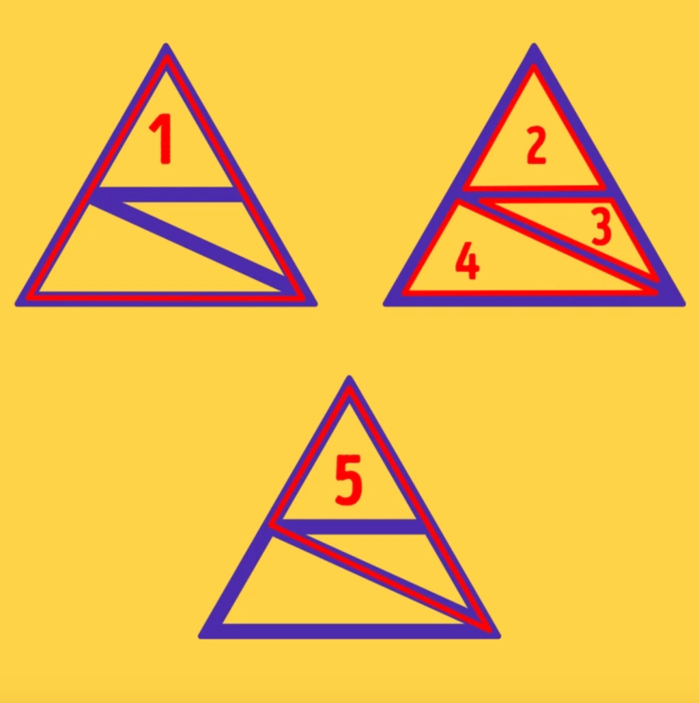Néhány háromszöget könnyű észrevenni, vannak azonban kevésbé nyilvánvalóak is köztük. Bár elsőre már jó pár háromszöget össze lehet számolni, a helyes megoldás valószínűleg meg fog lepni: összesen ugyanis 5 háromszög van elrejtve a képen. Az alábbi ábrán megnézheted a levezetését is: