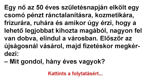 Minden nő számára nagy nap az ötvenedik születésnap. Sokan azonban ezt a mérföldkövet azzal a szándékkal ünneplik meg, hogy igazán kiadják magukból a maximumot. Egy nő, aki így látta, rengeteg pénzt költött ránctalanító kezelésekre, kozmetikai szolgáltatásokra, hajszabásra, ruhára, és amikor úgy érezte, hogy minden téren a legtöbbet hozta ki magából, boldogan elindult a városba.