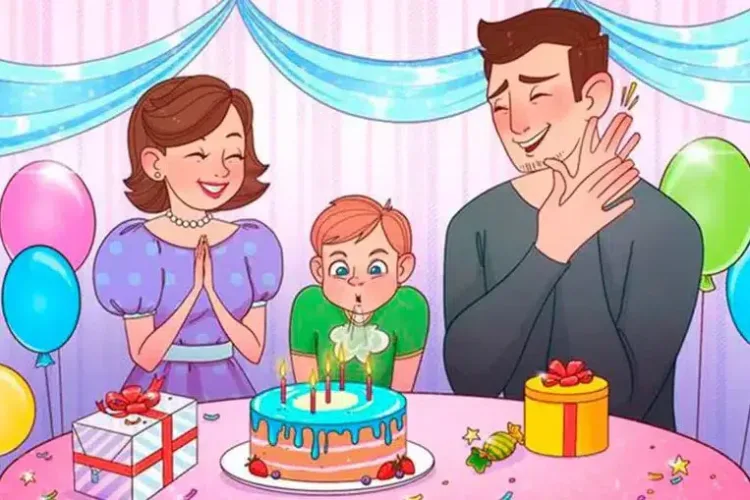 A rajzon egy családot látunk, anyát, apát és gyermeküket, aki épp a születésnapi tortáján fújja el a gyertyákat. Egy teljesen megszokott családi jelentről van szó, az asztalon színes ajándékok hevernek, a háttérben lufikat látunk, a szülők tapsolnak örömükben. A képben azonban van egy hiba, ami a valóságban nem történhet meg.