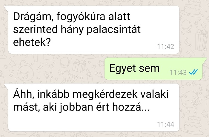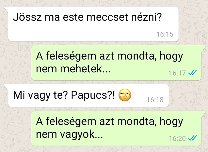 – Hát, drágám, az én életemben is gyakran előfordul ilyesmi… – válaszolta felesége, miközben alig rejtett vigyorral nézett a telefonja felől.