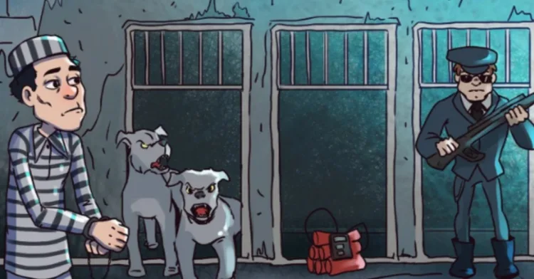 Három menekülési kijárat van, amelyeken keresztül a bűnöző kijuthat a börtönből. Az első kijáratnál agresszív kutyák vannak. A második ajtónál egy 5 perces időzítővel ellátott bomba található (már be van kapcsolva). A harmadik kijáratnál egy fegyveres őr áll. Melyik ajtón keresztül juthatna ki a bűnöző biztonságosan a börtönből?
