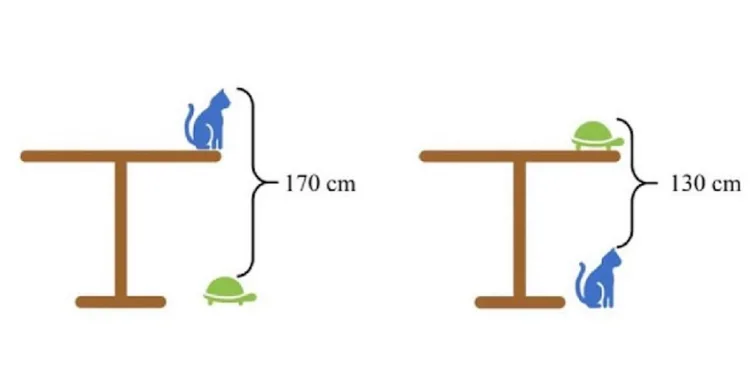 Az adatok a következők: a távolság az asztal tetején ülő macska füleitől a földön lévő teknősbékáig 170 cm. A távolság az asztalon lévő teknősbékától az asztalon ülő macska füléig 130 cm. Milyen magas az asztal?