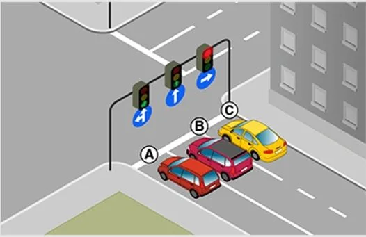 A képpel kapcsolatos kérdés első olvasatra egyszerűnek tűnik, így szól: melyik autó kanyarodhat jobbra jelen pillanatban?