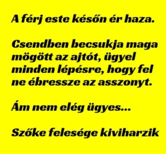 A férj este későn ér haza.Csendben becsukja magamögött az ajtót, ügyelminden lépésre, hogy felne ébressze az asszonyt.Ám nem elég ügyes…Szőke felesége kiviharzika szobából, és…