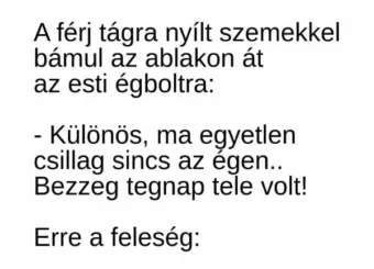 A férj tágra nyílt szemekkelbámul az ablakon átaz esti égboltra:– Különös, ma egyetlencsillag sincs az égen..Bezzeg tegnap tele volt!Erre a feleség:– Persze, hogy nincs.Tegnap…