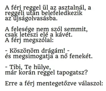 A férj reggel ül az asztalnál, areggeli után belefeledkezik az újságolvasásba.A felesége nem szól semmit, csak leteszielé a kávét. A férj megszólal:– Köszönöm drágám! – és…