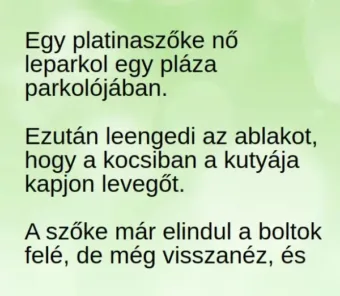 Egy platinaszőke nőleparkol egy plázaparkolójában.Ezután leengedi az ablakot,hogy a kocsiban a kutyájakapjon levegőt.A szőke már elindul a boltokfelé, de még visszanéz,…