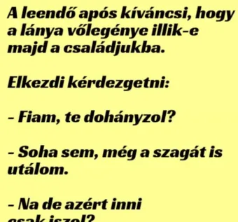 A leendő após kíváncsi, hogya lánya vőlegénye illik-emajd a családjukba.Elkezdi kérdezgetni:– Fiam, te dohányzol?– Soha sem, még a szagát isutálom.– Na de azért innicsak iszol?–…