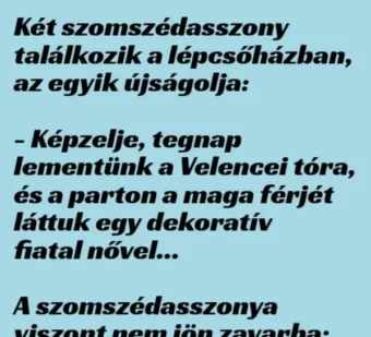 Két szomszédasszonytalálkozik a lépcsőházban,az egyik újságolja:– Képzelje, tegnaplementünk a Velencei tóra,és a parton a maga férjétláttuk egy dekoratívfiatal nővel…A…