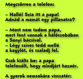 Megcsörren a telefon:– Halló! Szia itt a papa! Adnád a mamát egy pillanatra?– Most nem tudom papa, mert fent vannak a hálószobában a Sanyi bácsival.– Légy szíves tedd mellé a…