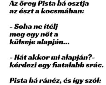 Az öreg Pista bá osztjaaz észt a kocsmában:– Soha ne ítéljmeg egy nőt akülseje alapján…– Hát akkor mi alapján?-kérdezi egy fiatalabb srác.Pista bá ránéz, és így szól:– Első…