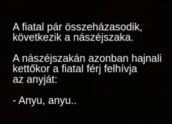 A fiatal pár összeházasodik,következik a nászéjszaka.A nászéjszakán azonban hajnalikettőkor a fiatal férj felhívjaaz anyját:– Anyu, anyu..– Mi az kisfiam?– A Zsuzsa…