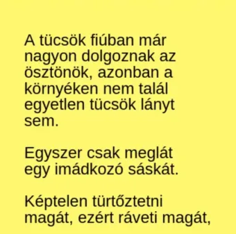 A tücsök fiúban márnagyon dolgoznak azösztönök, azonban akörnyéken nem találegyetlen tücsök lánytsem.Egyszer csak meglátegy imádkozó sáskát.Képtelen türtőztetnimagát, ezért ráveti…
