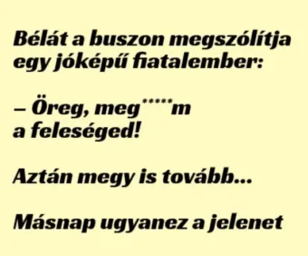 Bélát a buszon megszólítjaegy jóképű fiatalember:– Öreg, meg*****ma feleséged!Aztán megy is tovább…Másnap ugyanez a jelenetmegismétlődik.Béla este elmeséli atörténteket a…
