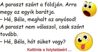 Bélát szántás közben megszólítja egy barátja.“Figyelj Béla, valami fontosat kell mondanom” – mondja a barátja.Béla nem válaszol, csak szánt tovább.“Béla, meghalt az anyósod” – böki…