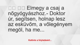 Elmegy a csaj a nőgyógyászhoz.- Doktor úr, segítsen, holnap lesz az esküvőm, a vőlegényem megöl, ha megtudja, hogy nem vagyok szűz.- Jó, feküdjön fel a vizsgálóasztalra.A csaj…
