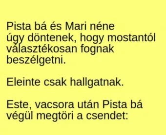 Megosztom a Facebookon: Katt a gombra! Pista bá és Mari néne úgy döntenek, hogy mostantól választékosan fognak beszélgetni. Eleinte csak hallgatnak. Este, vacsora után Pista bá…