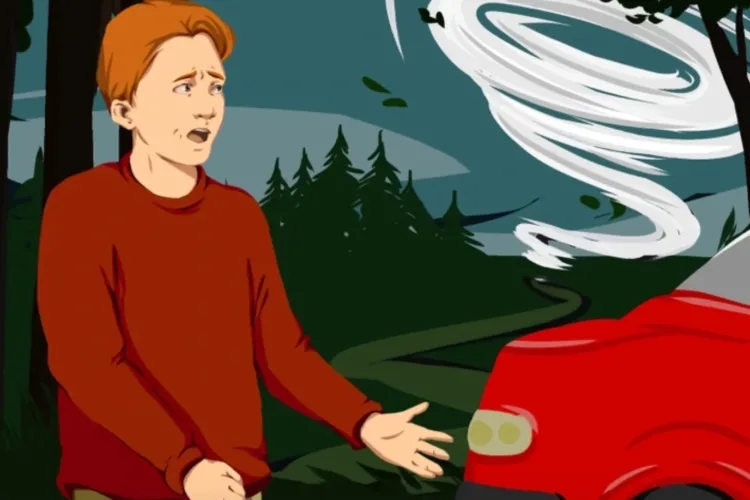 A képen látható férfi épp rosszkor volt rossz helyen és szembetalálkozott egy igen méretes tornádóval. A fejtörő három lehetőséget kínál neki: megpróbálhat felmászni egy fa tetejére, hogy az ágba kapaszkodva vészelje át a szélvihart, vagy elbújhat egy árokban, esetleg megpróbálhat a kocsijával menekülni a csapás elől.