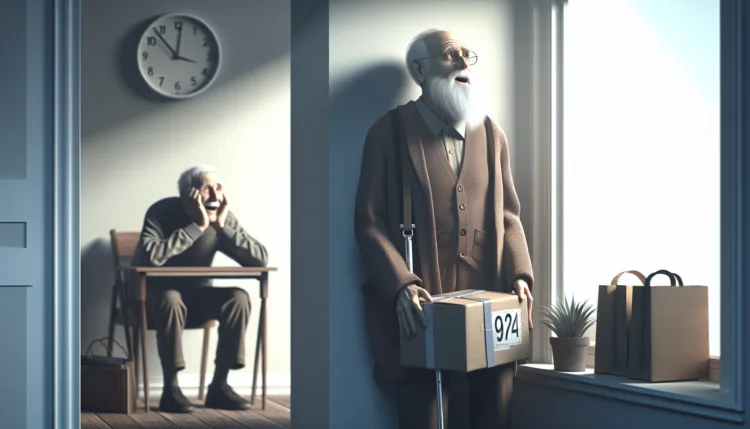 Egy ember áll a buszmegállóban, és nagyon türelmetlenül néz az órájára.
