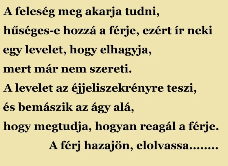 A feleség meg akarja tudni, hűséges-e hozzá a férje, ezért ír neki egy levelet, hogy elhagyja, mert már nem szereti.