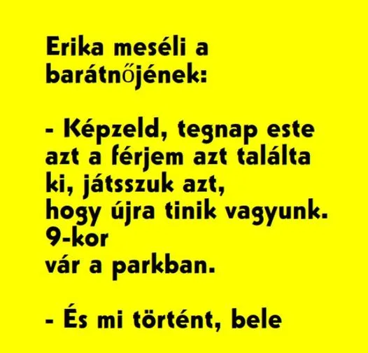 – Képzeld, tegnap este azt a férjem azt találta ki, játsszuk azt, hogy újra tinik vagyunk.9-kor vár a parkban.