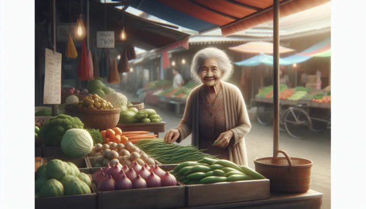 A nyugdíjas néni a piacon árulja a zöldségeket.
