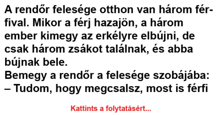 Mikor a férj hazajön, a három ember kimegy az erkélyre elbújni, de csak három zsákot találnak, és abba bújnak bele.