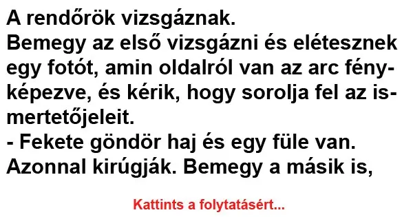 Mikor megy ki az ajtón, a harmadik jelentkezőnek a fülébe súgja, hogy csak azt ne mondja, hogy egy füle van, mert akkor megbuktatják.