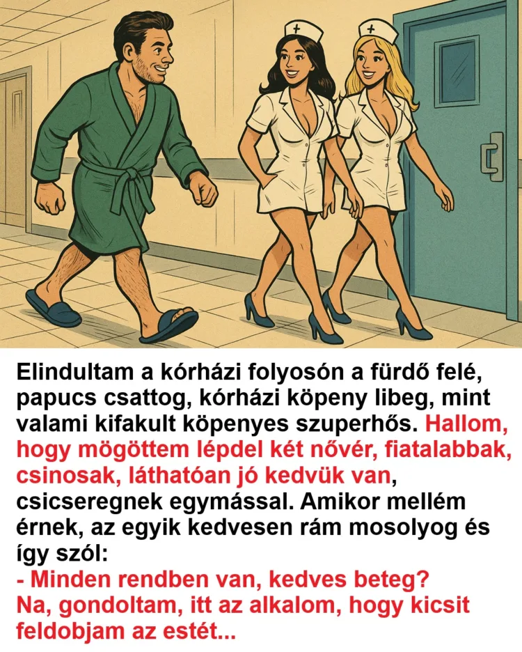 Elindultam hát a kórházi folyosón a fürdő felé, papucs csattog, kórházi köpeny libeg, mint valami kifakult köpenyes szuperhős.
