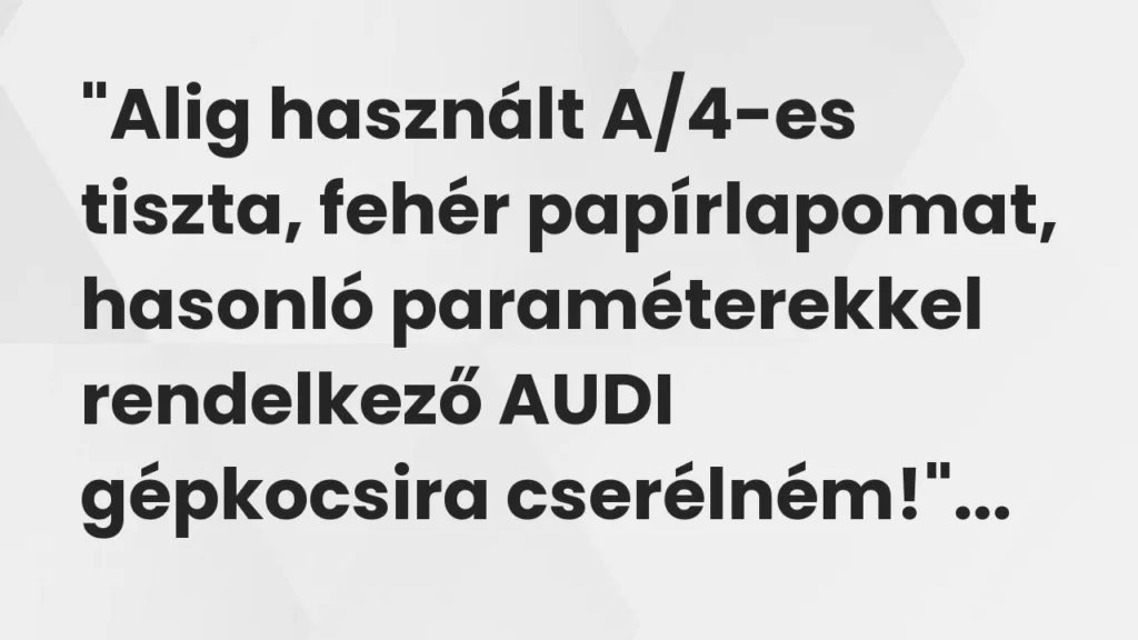 „Alig használt A/4-es tiszta, fehér papírlapomat, hasonló paraméterekkel rendelkező AUDI gépkocsira cserélném!