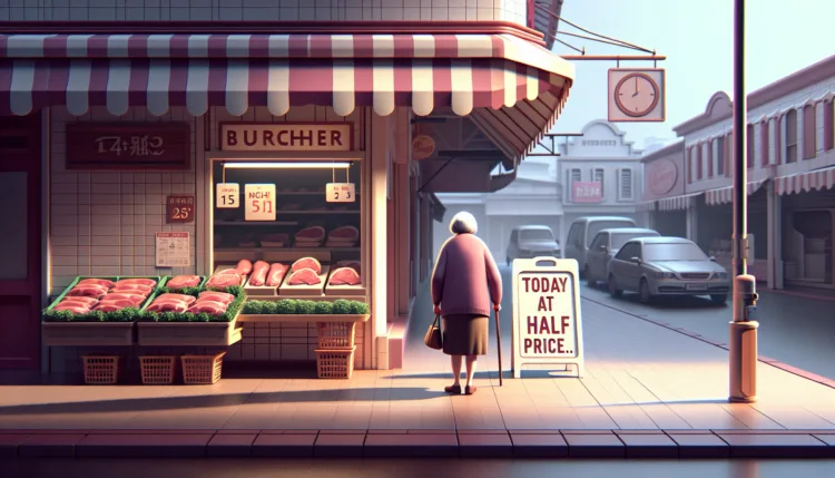 Az idős hölgy sétál a piacon, amikor meglát egy hentesbolt előtt egy tábla: