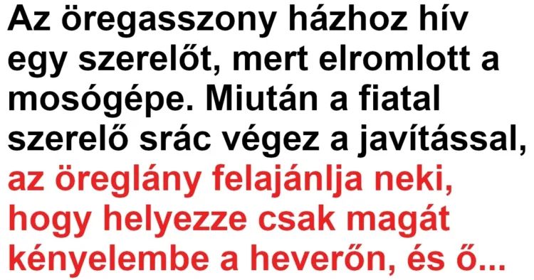 Az öregasszony házhoz hív egy szerelőt, mert elromlott a mosógépe.
