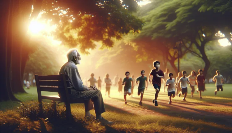 Egy idős bácsi a parkban ül, és nézi a fiatalokat, amint futkároznak.