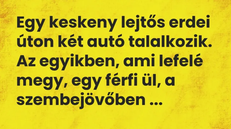 Egy keskeny lejtős erdei úton két autó talalkozik.