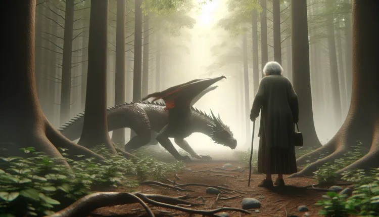 Egy öregasszony megy az erdőn, amikor egyszer csak egy sárkány tűnik fel előtte.