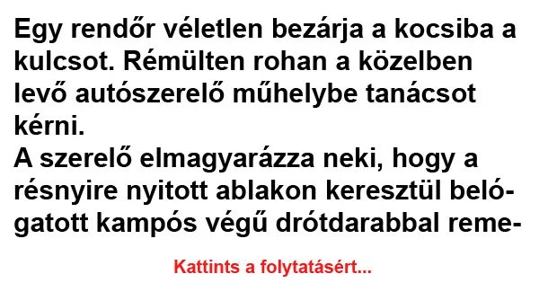 Pár perc múlva a szerelő kimegy, megnézni hogy halad a rendőr, de meglepetésére hatalmas csődületet talál, mindenki a hasát fogja a röhögéstől.