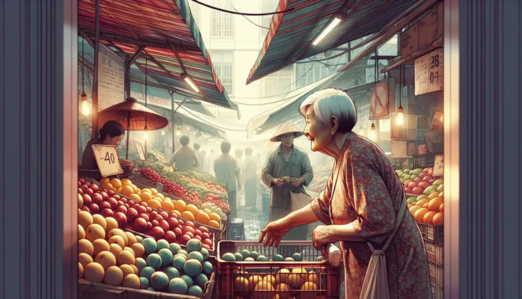 Egyszer egy öreg néni megy a piacon, és lát egy árust, aki friss gyümölcsöt árul.