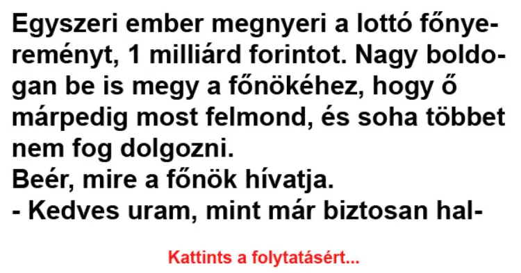 Nagy boldogan be is megy a főnökéhez, hogy ő márpedig most felmond, és soha többet nem fog dolgozni.