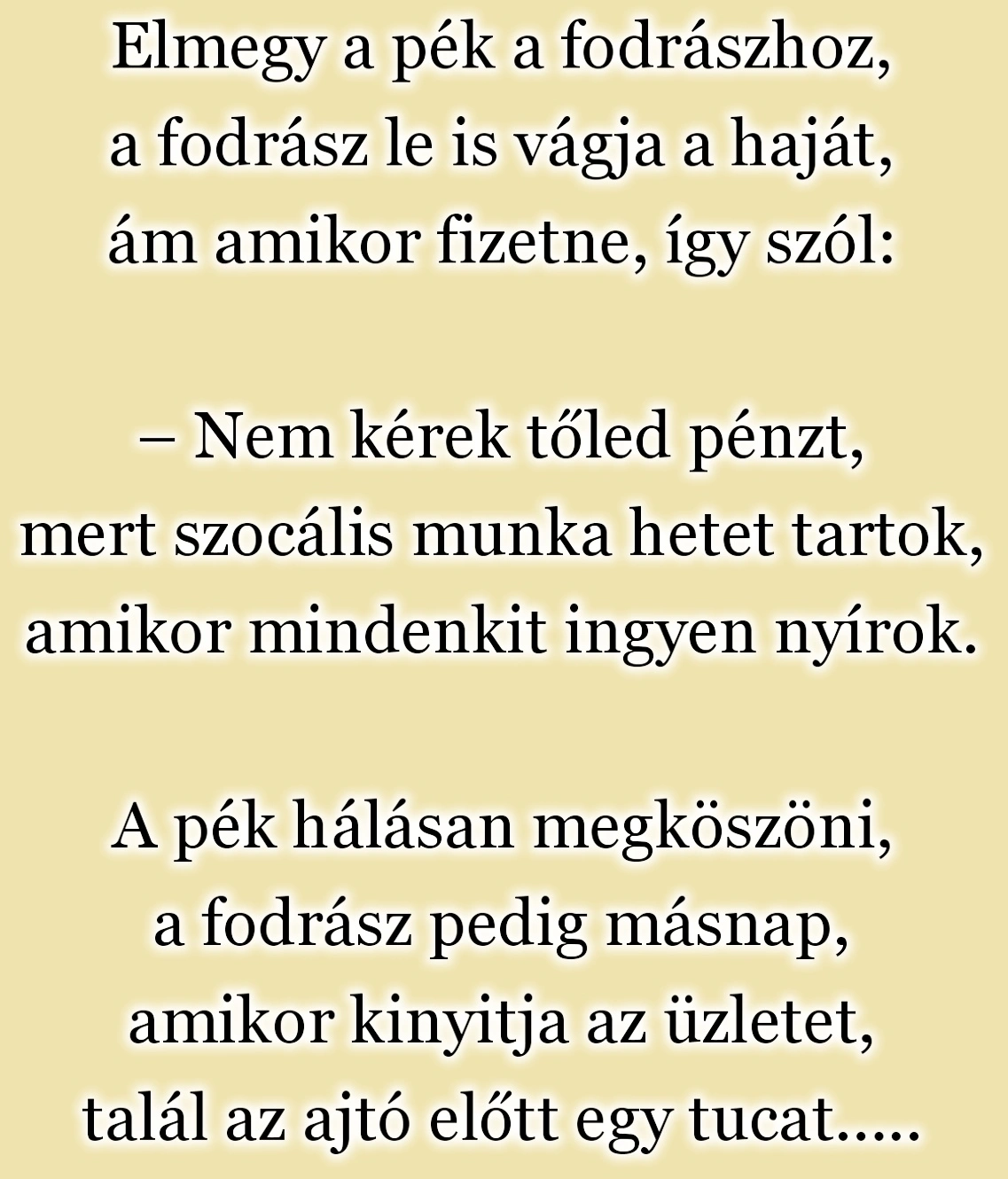 A pék hálásan megköszöni, a fodrász pedig másnap, amikor kinyitja az üzletet, talál az ajtó előtt egy tucatfinom, friss péksüteményt.